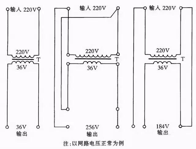 采用此法应注意两点:一是在接线前必须把行灯变压器次级一端与壳体的连接线(保护接地线)拆除;二是要注意行灯变压器的初、次级绕组的电流都不能超过各自的额定电流值。