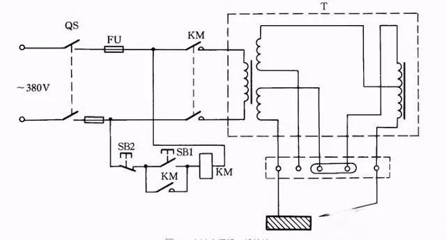 交流电焊机一般接法如图39所示。当合上刀闸QS时,按下按钮SB1,接触器KM得电吸合;松开按钮SB1时,KM自锁触点自锁,电焊机继续得电工作。当按下SB2时,电焊机停止工作。