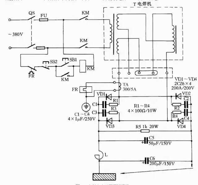 电路中VD1 ~ VD4 为4 只硅整流二极管;R1 ~ R4、C1 ~ C4组成硅整流器件的过压保护电路;FR 为过流继电器,保护硅整流器件。当负载电流超过额定值时,电流互感器次级电流相应增加,带动继电器FR 动作,FR 常闭触点打开,接触器KM 释放,触点打开切断电焊机电源。硅整流器件用0. 25kW 风扇作风冷设备。图中,C5 为滤波电容,R5 为泄放电阻。