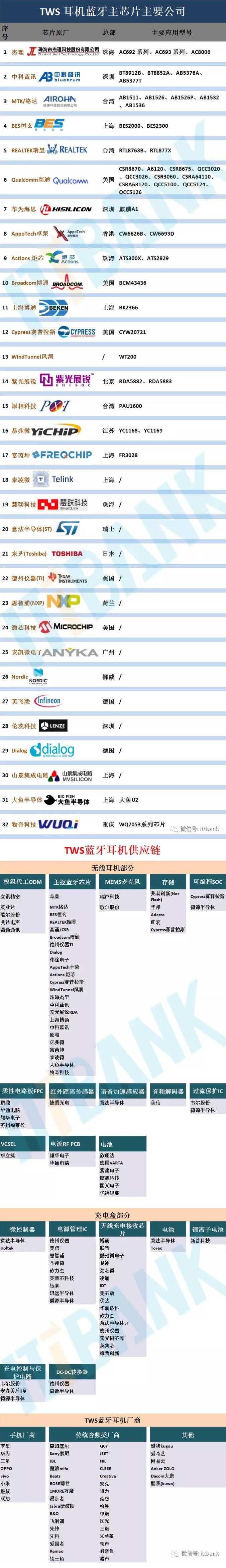 TWS耳机蓝牙主芯片方案32家及其全产业链!