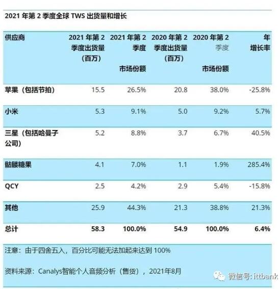 近日,Canalys报告显示,在连续几个季度均以两位数的势头强劲增长后,TWS出货量似乎已临近顶峰,增长率降至6.4%,2021年第二季度整体仅出货5830万台,创三年以来新低。