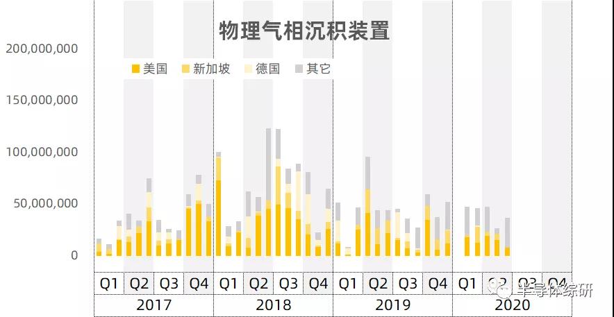 与热处理扩散设备和CVD设备不同,我国进口的PVD设备的高峰在2018年。2019和2020进口数额反而有下降趋势,而且金额总数也相对偏低。同期进口只有21亿美金