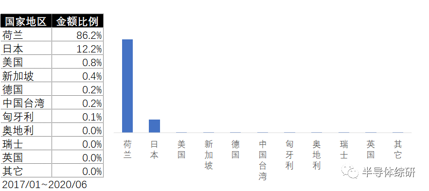 而从进口来源国家地区来看,我们的进口高端光刻机基本都是来自于荷兰和日本,其中荷兰一国占据86.2%