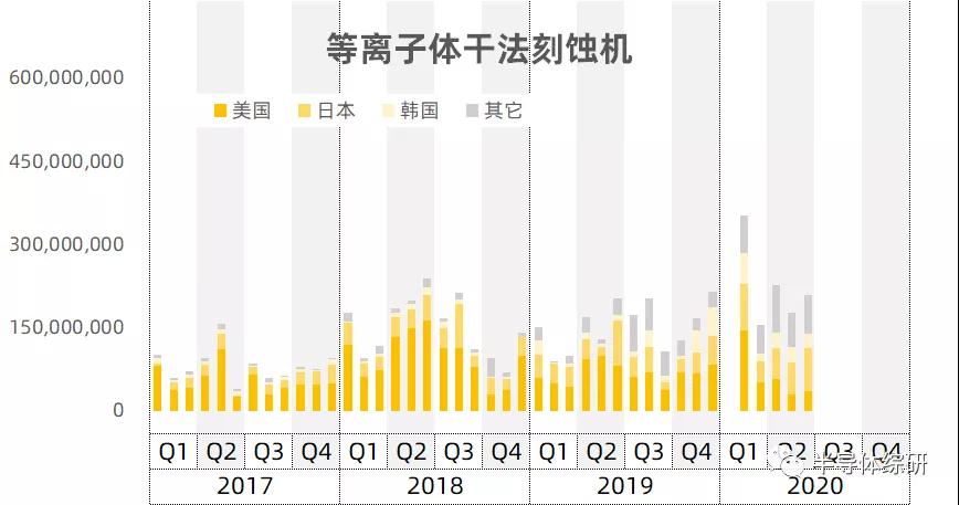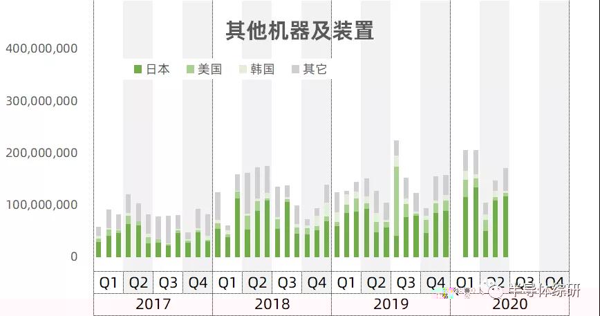从进口来源地来看,主要还是美国和日本为主。韩国也有一些份额,我个人猜测是SEMES的刻蚀设备,主要应该是供应国内三星工厂