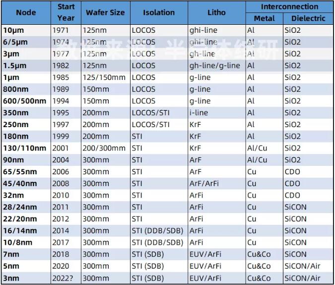 对于多数人而言,代表半导体工艺水平的线宽尺寸自然耳熟能详,但是随着电路图形的不断缩小,各种新的技术和材料、甚至晶体管本身的结构也发生着变化。为了方便大家参考了解,我特地查找资料并咨询行业专家,整理了一个制造工艺演进表欢迎大家参考和分享