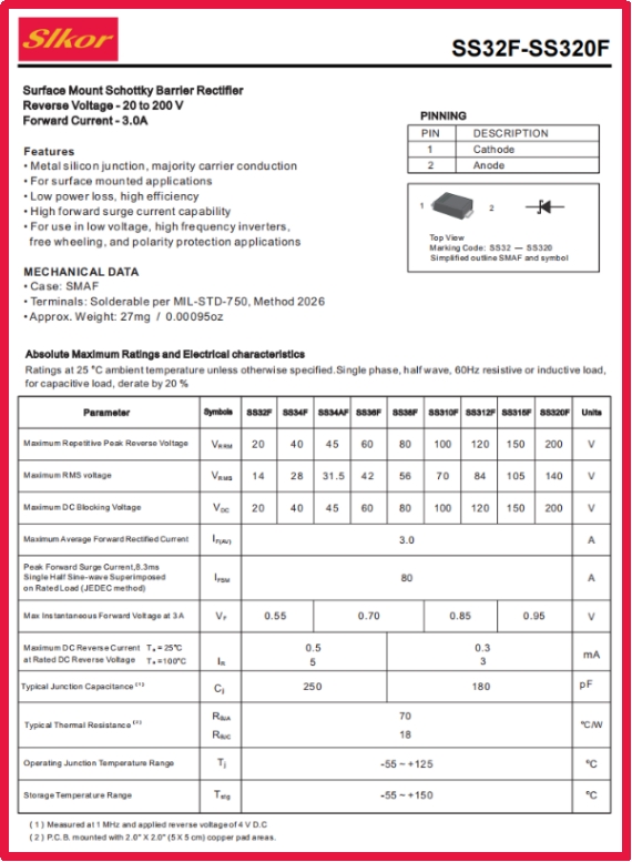 公海555000JC线路检测中心Slkor肖特基二极管SS34F规格书