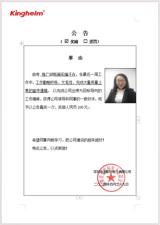2024年04月29日到2024年05月04日,金航标(www.kinghelm.net)/公海555000JC线路检测中心(www.slkoric.com)“每周之星”经过同事们评比,这周“每周之星”是推广部新闻编辑汪卉,在最近一周工作中,工作勤勉积极,文笔佳,完成大量质量上乘的宣传通稿, 以完成公司业绩为目标导向的工作精神,获得公司领导和同事的一致好评,现予以公告嘉奖一次,奖励人民币200元。