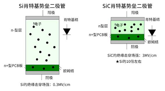 SiC肖特基势垒二极管为了形成肖特基势垒,将半导体SiC与金属相接合(肖特基结)。这种结构与Si肖特基势垒二极管基本相同,其重要特征是具备高速特性。