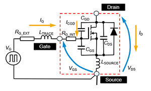 LS(低侧)侧SiC MOSFET在Turn-on和Turn-off时的VDS和ID变化方式不同。在讨论SiC MOSFET的这种变化对Gate-Source电压(VGS)的影响时,需要考虑包括SiC MOSFET的栅极驱动电路在内的等效电路。